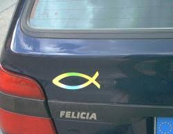 Der Fisch als religiöses Symbol, welchen man oft als stilisierten Aufkleber auf Autos findet , leitet sich von einer Art geheimem griechischen Gruppenkennwort der ersten Christen ab: