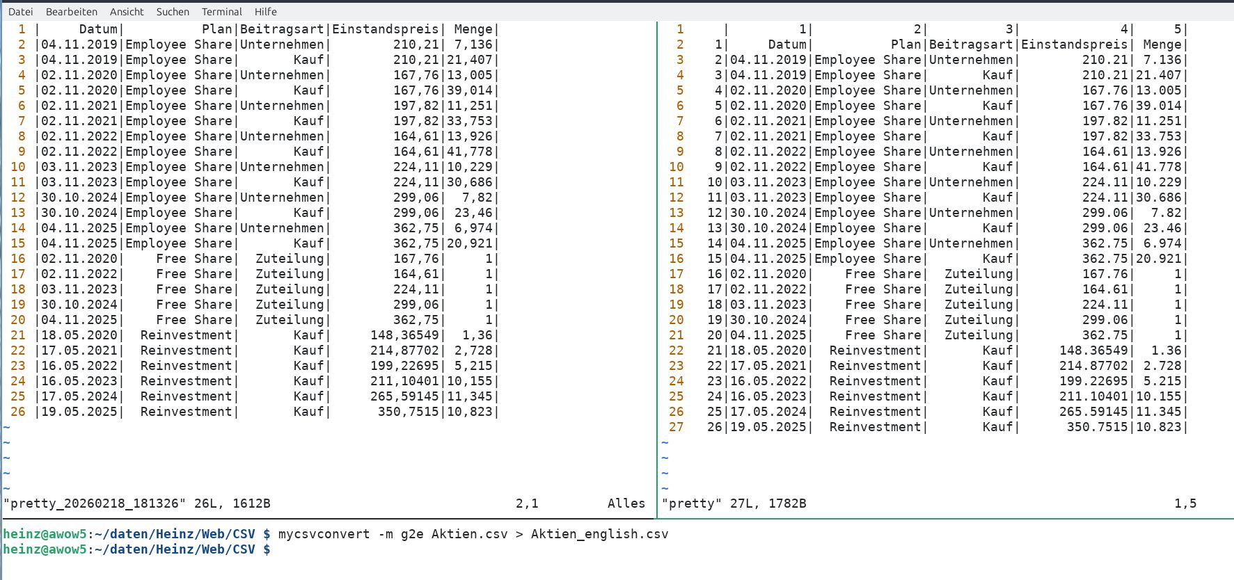 - mycsvconvert -m g2e Aktien.csv > Aktien_english.csv