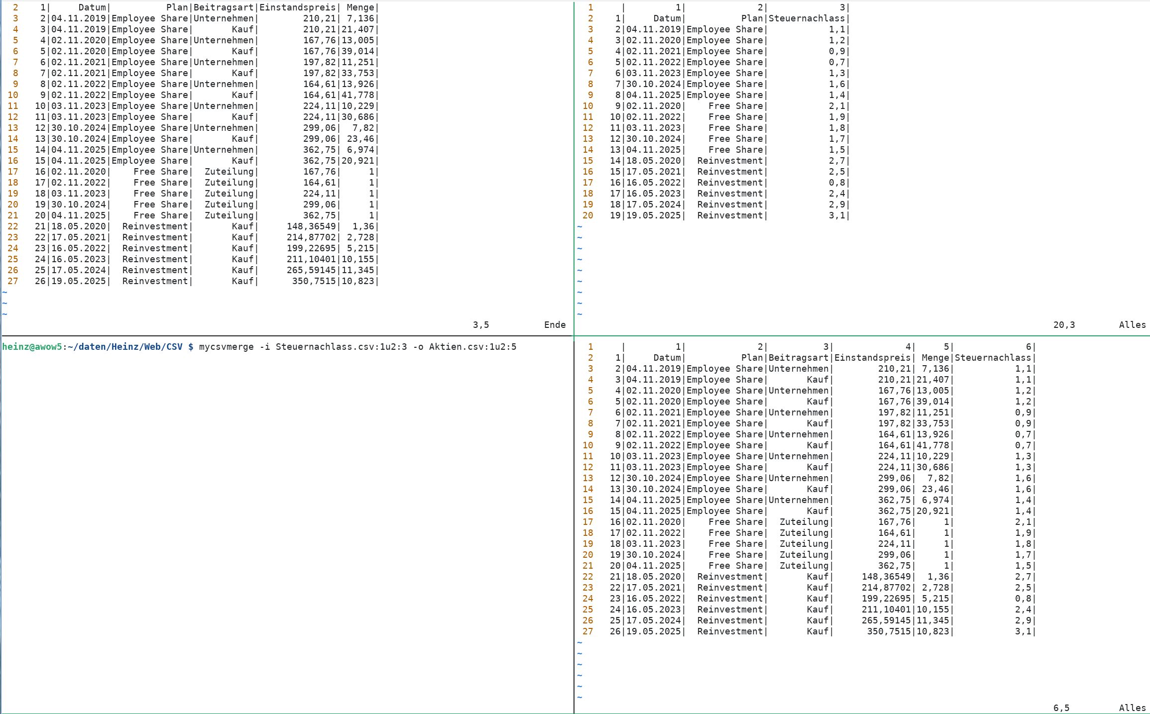 - mycsvmerge -i Steuernachlass.csv:1u2:3 -o Aktien.csv:1u2:5