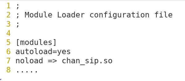 - Legt fest, welche Module geladen werden sollen; hier ausreichend ist, alle Module zu landen und chan_sip, den Voränger von chan_pjsip, auszuschließen