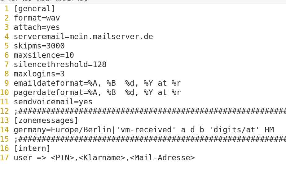 - hier werden die Sprachnachrichten-Konten festgelegt; dazu sind (hier in der letzten Zeile) je Mailbox nur eine PIN, optional ein Klarname und eine Mailadresse anzugeben. Die Mailbox des Beispieles hat den Kontext intern