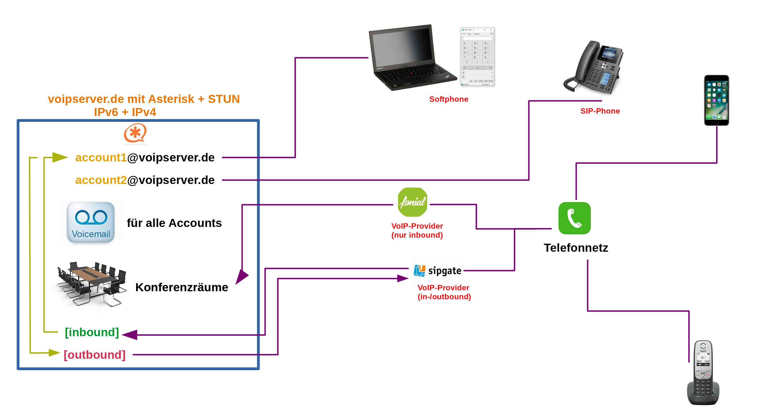 Da die Gesamtthematik SIP, RTP, IPv4/IPv6, NAT, STUN, Firewall nicht ganz trivial ist, die meisten Anleitungen, aber auch Standardwerke lange veraltete Asterisk-Versionen heranziehen und keine mir bekannte Quelle alle Aspekte umfasst, sei eine aktuelle Konfiguration für die eigene Cloud-Telefonanlage hier kompakt zusammengefasst. Diese bietet neben beliebig vielen weltweit erreichbaren Anschlüssen und Konferenzräumen unbegrenzter Teilnehmerzahl natürlich auch Sprachnachrichten inkl. Mailversand und die Anbindung an das öffentliche Telefonnetz.