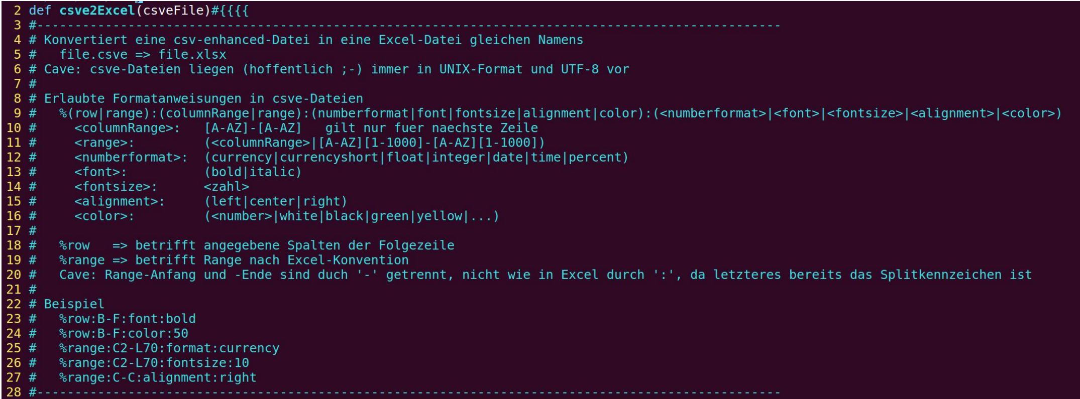 Folgende 2 Ruby-Funktionen (Start von Excel und Generierung von .xlsx aus .csve) sind dazu unter Windows ausreichend. {{{{ }}}} sind Faltungsanweisungen für vim (cf. hierzu den Kasten "Anmerkungen" z.B. hier Skripte).Impressum