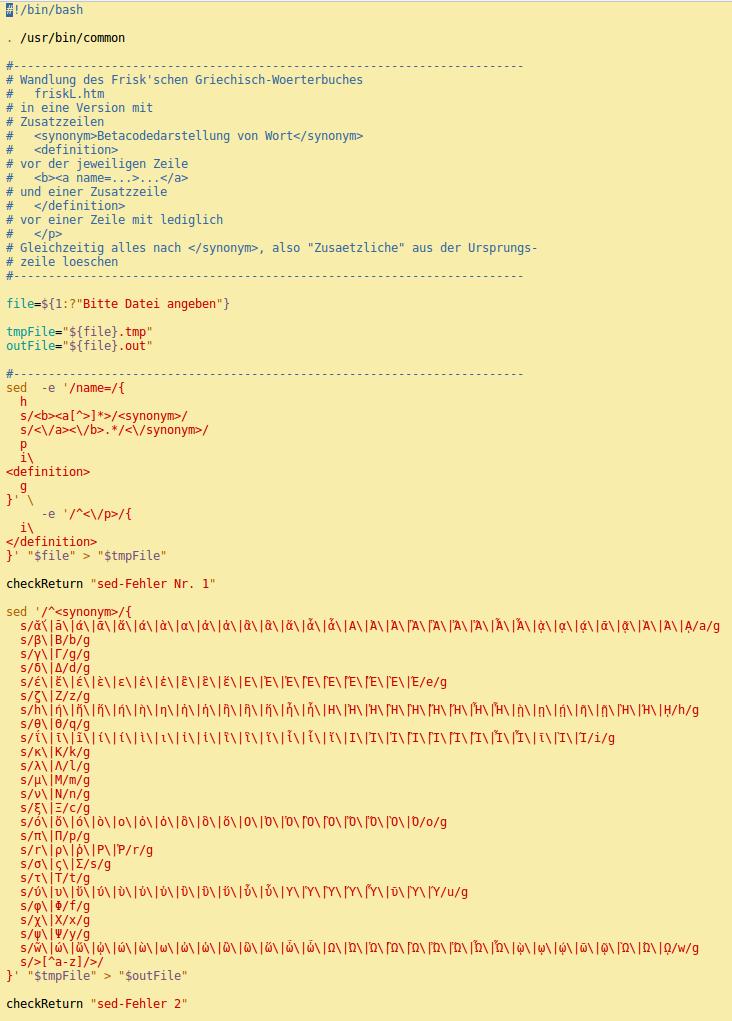 Liegt ein Wörterbuch bereits (nicht in Betacode, sondern Altgriechisch) digital vor, muss es in einem ersten Schritt mit sed um spiritus, Akzente, iota sub-/ascripta bereinigt in Betacode gewandelt werden