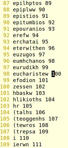 Indexdatei aus allen ersten Worten einer Wörterbuchdoppelseite in Betacodedarstellung ohne spiritus in Reihenfolge des griechischen Alphabetes